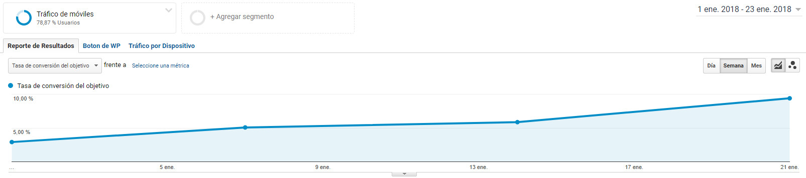 En la imagen se puede ver cómo aumentó la tasa de conversión en enero a partir del cambio que le hicimos a la página para dispositivo móvil, en el que, además de cambiarle el diseño,redujimos la cantidad de acciones posibles.